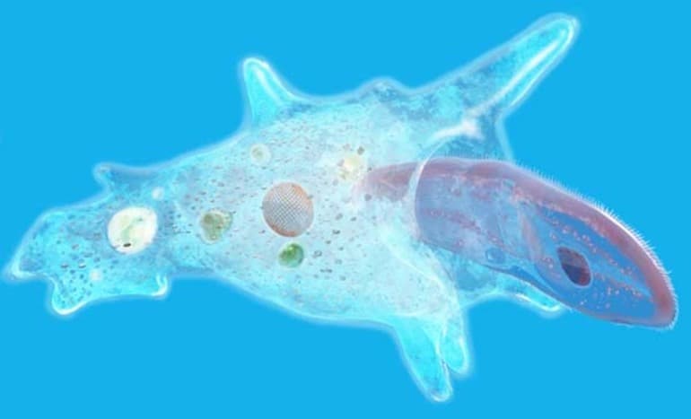 В питание микроорганизмов входят водоросли и обыкновенные простейшие, которые перевариваются вакуолями, образующимися в цитоплазме. Это пузырьки жидкости с пищеварительными ферментами, которые выделяет плазмалемма вокруг пищевых частиц.