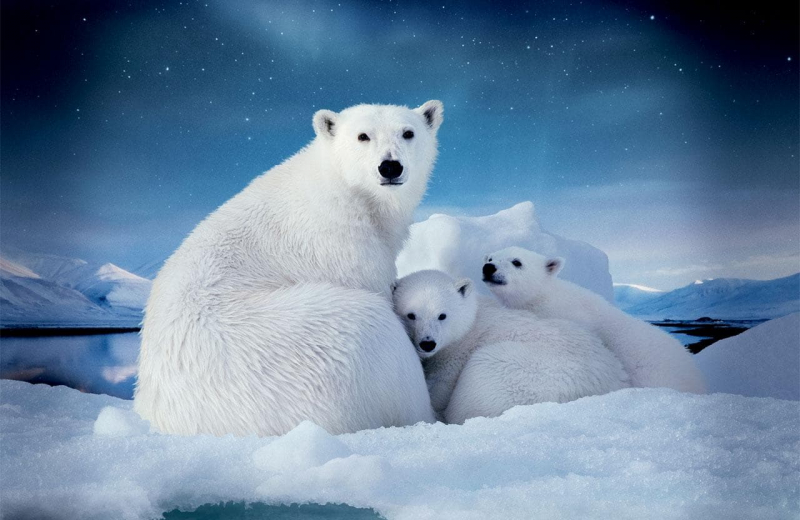 Белый или полярный медведь является самым крупным и сильным хищником. В длину может достигать до 3 м и весить почти 700 кг. Как и многие животные Арктики, имеет белый мех, который позволяет ему незаметно передвигаться по заснеженным ландшафтам. Охотится он на тюленей, которых может убить одним ударом лапы.