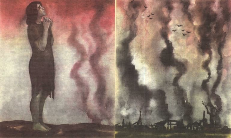 Очнувшись от воспоминаний, голодная женщина пошла к огородам, где бродили брошенные коровы. Она подоила их, с тех пор животные стали ходить за ней. В хуторе она увидела, что все было сожжено — дома, сараи, другие хозяйственные постройки. Но остался целым ее погреб, где можно было укрыться от холода и выжить.