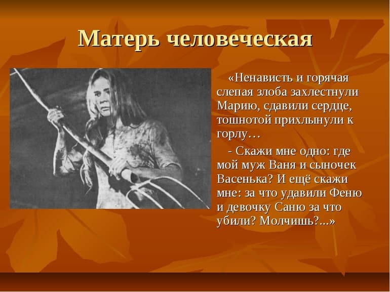 Главную героиню автор не зря назвал Марией, ведь она воплощала образ Богоматери. Иван — это ее муж, а Вася — сын. Оба погибли от рук немецких солдат. Соседняя девочка Саня Зименкова осталась без родителей, поэтому женщина приютила ее и по-настоящему страдала, когда та скончалась от ранений.
