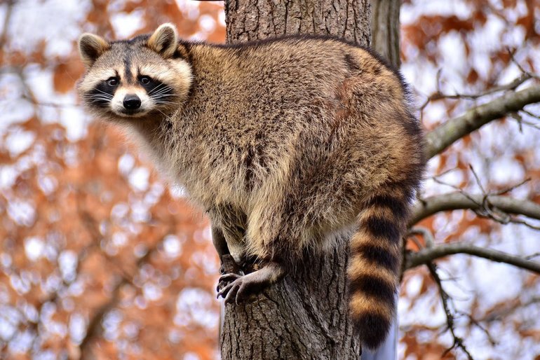 Енот — это животное с массой тела не более 12 кг и длиной до 70 см. Он покрыт густой серо-бурой шерстью, а на пышном хвосте есть черные полосы. Плотная шкура защищает зверька от укусов насекомых, а на солнце его мех искрится.