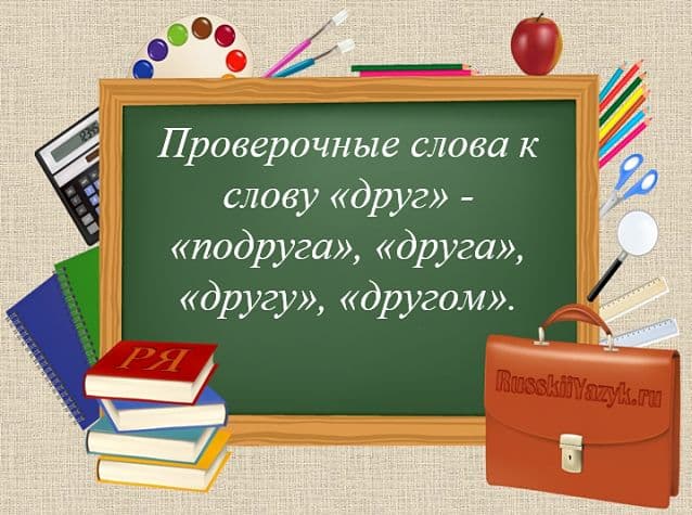 Проверочные сло­ва к сло­ву «друг» — «подру­га», «дру­га», «дру­гу», «дру­гом».