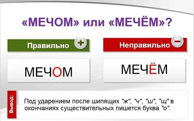В окончании существительного «мечом» в форме творительного падежа единственного числа после шипящего под ударением пишется буква