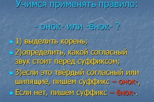 Суффикс -онок- пишется после твердых согласных и шипящих корня существительных, суффикс -ёнок — после мягких согласных, кроме «ч», в