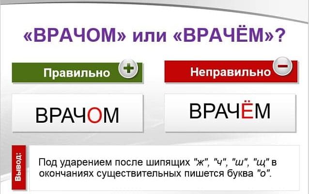 В окончании существительного «врачом» пишется буква «о» после шипящего. Чтобы выбрать правильный вариант написания слова «врачом» или