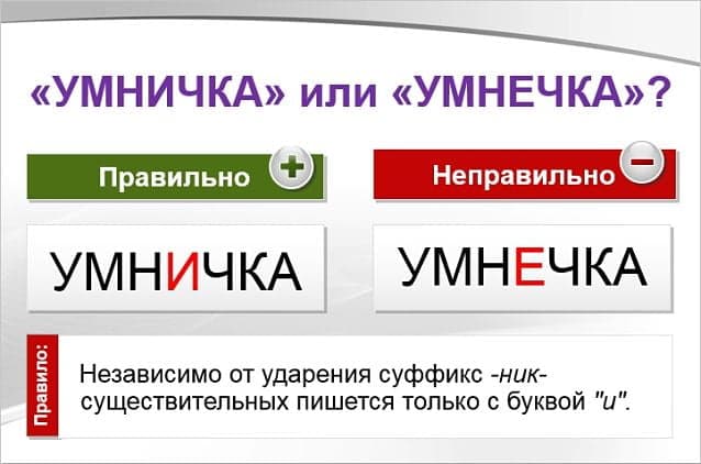 Как правильно написать слово «умничка» или «умнечка»? В выборе правильного варианта написания анализируемого слова придется прибегнуть не к поиску проверочного слова, а к правилу правописания суффиксов существительных.